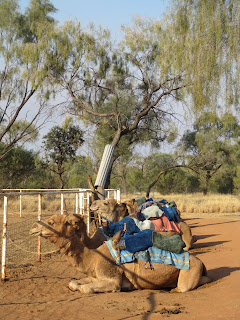 I've been wanting to go camel riding since I first found out they have camels in Australia. There are actually thousands of wild camels in Australia and the ones we rode were caught and tamed. The one that I rode was caught in the Simpson Desert, southeast of Alice Springs. Her name is Trillion. She is the lead camel and the camels all know this. Damon was our guide, and being on the lead camel, we were able to ask him questions all through the ride. It was just for an hour and my assbones sure knew it by the time we returned. It was a terrific ride, and the camels were well behaved. Apparently they do NOT spit, that is llama's that spit. They didn't smell too bad, though the camel behind me that my friend K. was riding had terrible breath and a breathing problem, causing him to sound like either Darth Vader or Hannibal Lector...and did you know that it was camels that provided the voice for Chewbacca in Star Wars?
